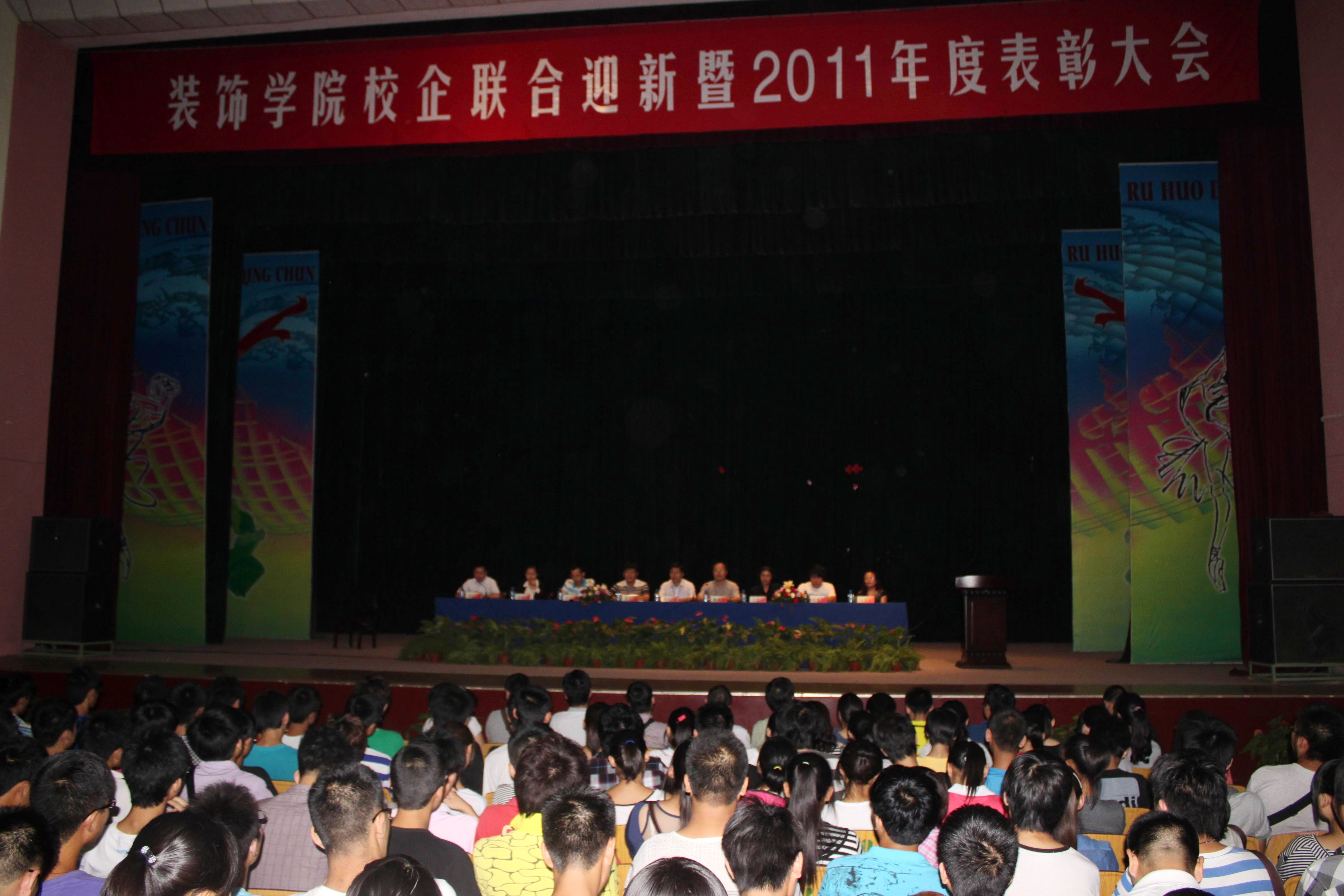 建筑装饰艺术公司精心选择在2011级新生入学之际,与企业联合开展迎新活动,在新生入学教育中极力融入企业、行业的元素,受到了装饰学子的热烈欢迎。会上,孙亚峰经理首先发表了热情洋溢的讲话,对2011级新生表示热烈地欢迎,并对装饰公司一年来的校企合作情况作了全面的回顾与总结;上海睿合广告传播有限公司、徐州清大吉博力建材有限公司、江苏水立方建筑装饰设计院、徐州天力建筑装饰工程公司4家深度合作企业表彰了2010年度企业奖学金获得者并颁发了荣誉证书与奖学金;副董事长沈士德和公司党总支书记黄立营共同为在学业、技能、服务、文体等方面表现突出的“艺术之星”颁奖;徐州天力建筑装饰工程公司总经理李宝珠为全体员工作了《艺术人生·名师讲坛》专题讲座。