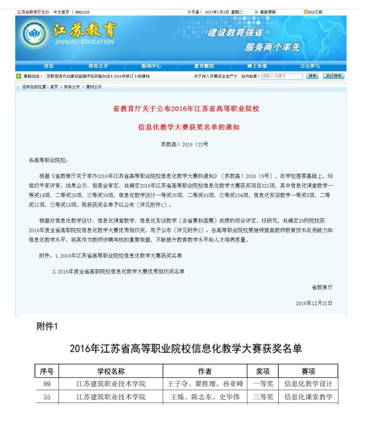 12月21日,根据《省教育厅关于公布2016年江苏省高等职业院校信息化教学大赛获奖名单的通知》(苏教高﹝2016﹞23号),确定2016年江苏省高等职业院校信息化教学大赛获奖项目,公司获得信息化教学设计一等奖1项、信息化课堂教学三等奖1项。特此祝贺。