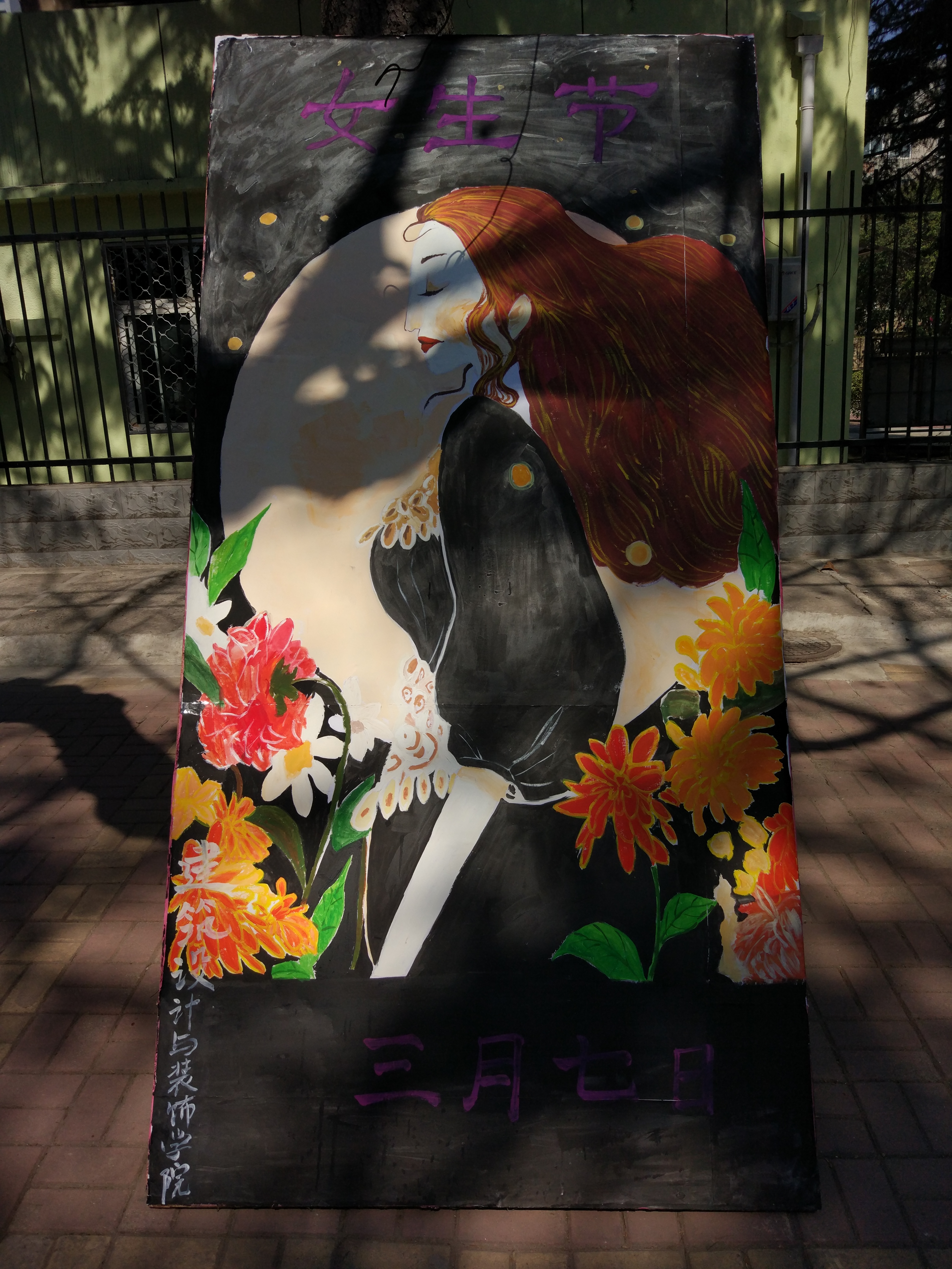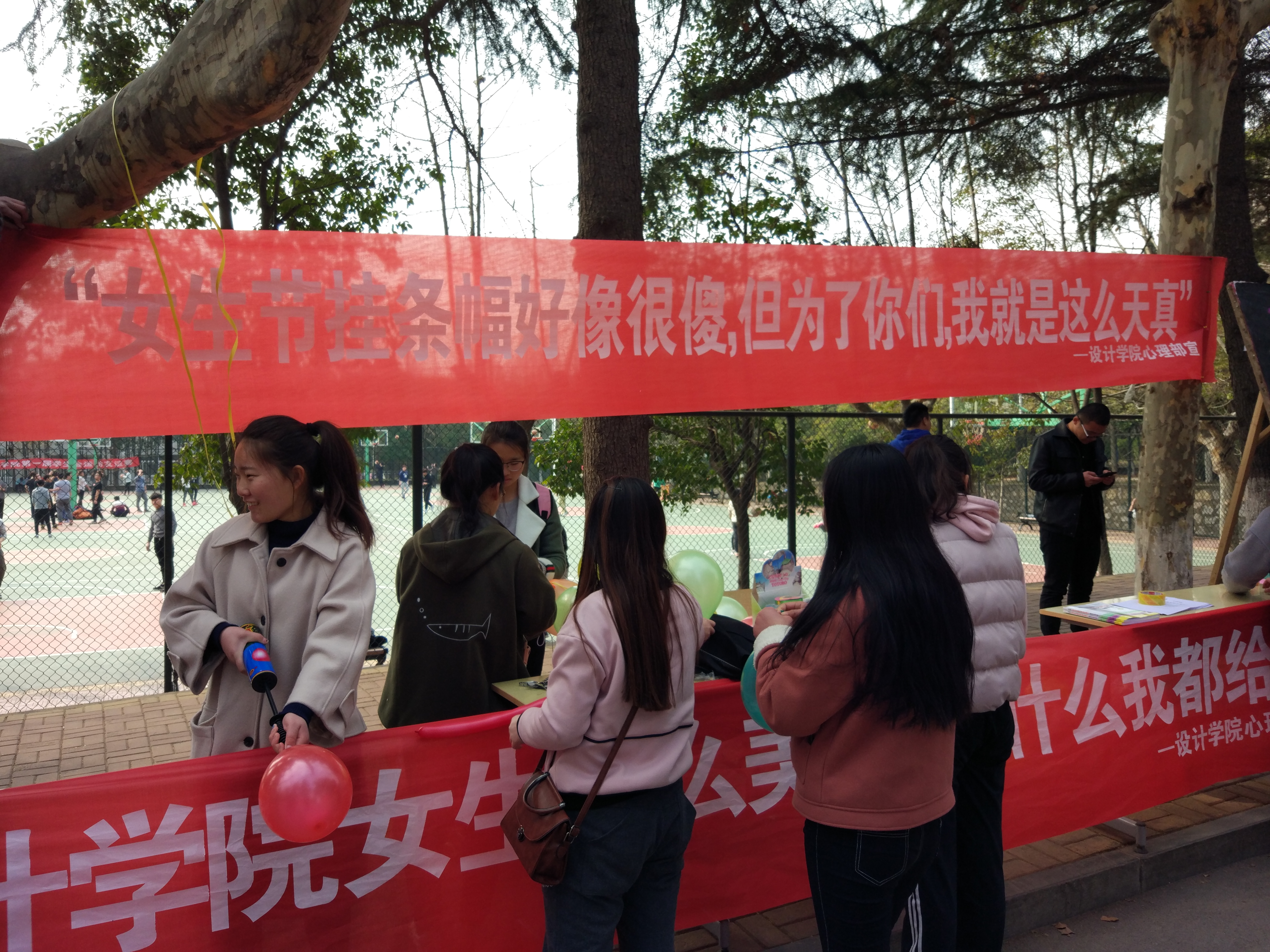 活动前期心理部在林荫大道拉横幅做宣传,“设计公司女生那么美,你要什么我都给”“女生节挂横幅好像很傻,但为了你们,我就这么天真”等。中午11点半活动正式开始,活动现场分发设计公司心理部男生编写的《女生自我保护常识》宣传单,像诗一样美却又贴合实际;其次参与活动的每位女生同学通过答题的方式获取一份小礼物,并由心理部干事献上鲜花以及祝福;最后,女生们在心愿板上贴上自己的愿望。