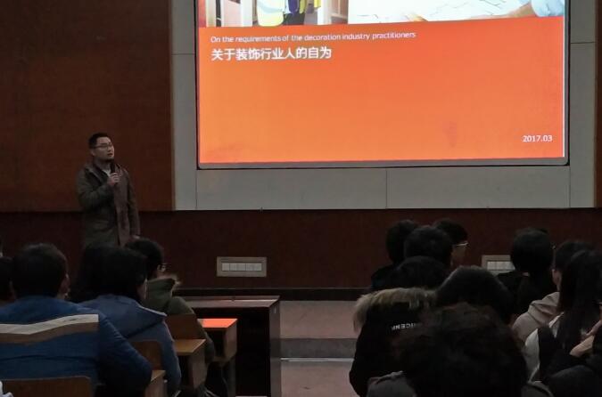 苏翔理老师从设计师、施工项目经理及材料供应商三个维度对装饰行业人进行了解读与讨论,引导同学们认识本专业相关课程与将来进入装饰行业直接的关系。讲座中,苏翔理老师寄语同学在学习过程中应:“忘记自己员工的身份,更多的以行业新人要求自己,自觉通过平时学习与生活多的积累更多行业信息及工作经验”。并帮助同学规划大一至大三公司的三次企业实践机会的利用,更好的完善自我,为将来顺利入职社会工作做好准备。