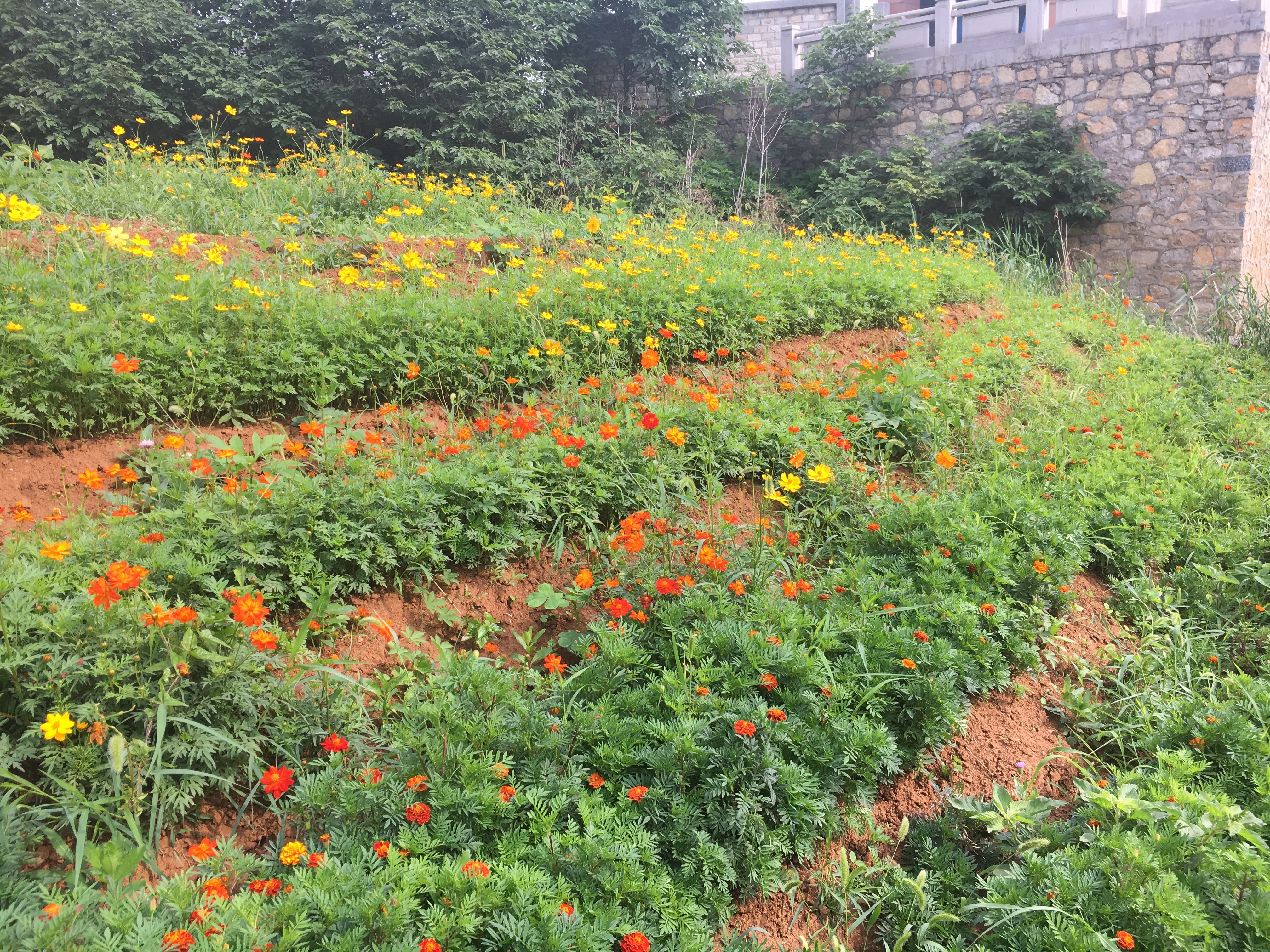 建院是我家,美化靠大家。公司吴小青等教师带领园林工程技术专业15级员工利用植物栽培与养护课程种子播种实训的时机对公司西校门南侧利亚楼后的荒地进行开垦,将泄洪沟内岛上荒地播种了“熊童子”向日葵、孔雀草、硫华菊等花卉种子,经过同学们精心照顾,花种子在很难成长的山红土中发芽了。炎炎夏日,同学们不辞辛苦利用课余时间去给浇水、除草,功夫不负有心人,如今竞相开放,杂草丛生荒地变成校园内一道靓丽风景线。