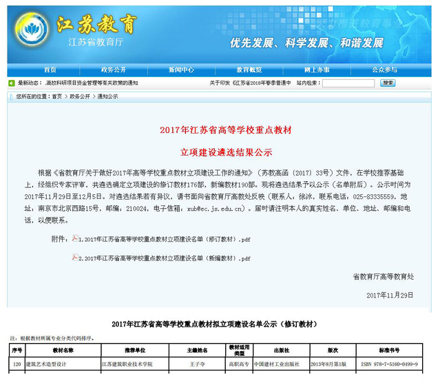 根据《省教育厅关于做好2017年高等公司重点教材立项建设工作的通知》(苏教高函〔2017〕33号)文件,在公司推荐基础上,经组织专家评审,公司王子夺副教授主编的教材《建筑艺术造型设计》立项江苏省高等公司重点教材建设。