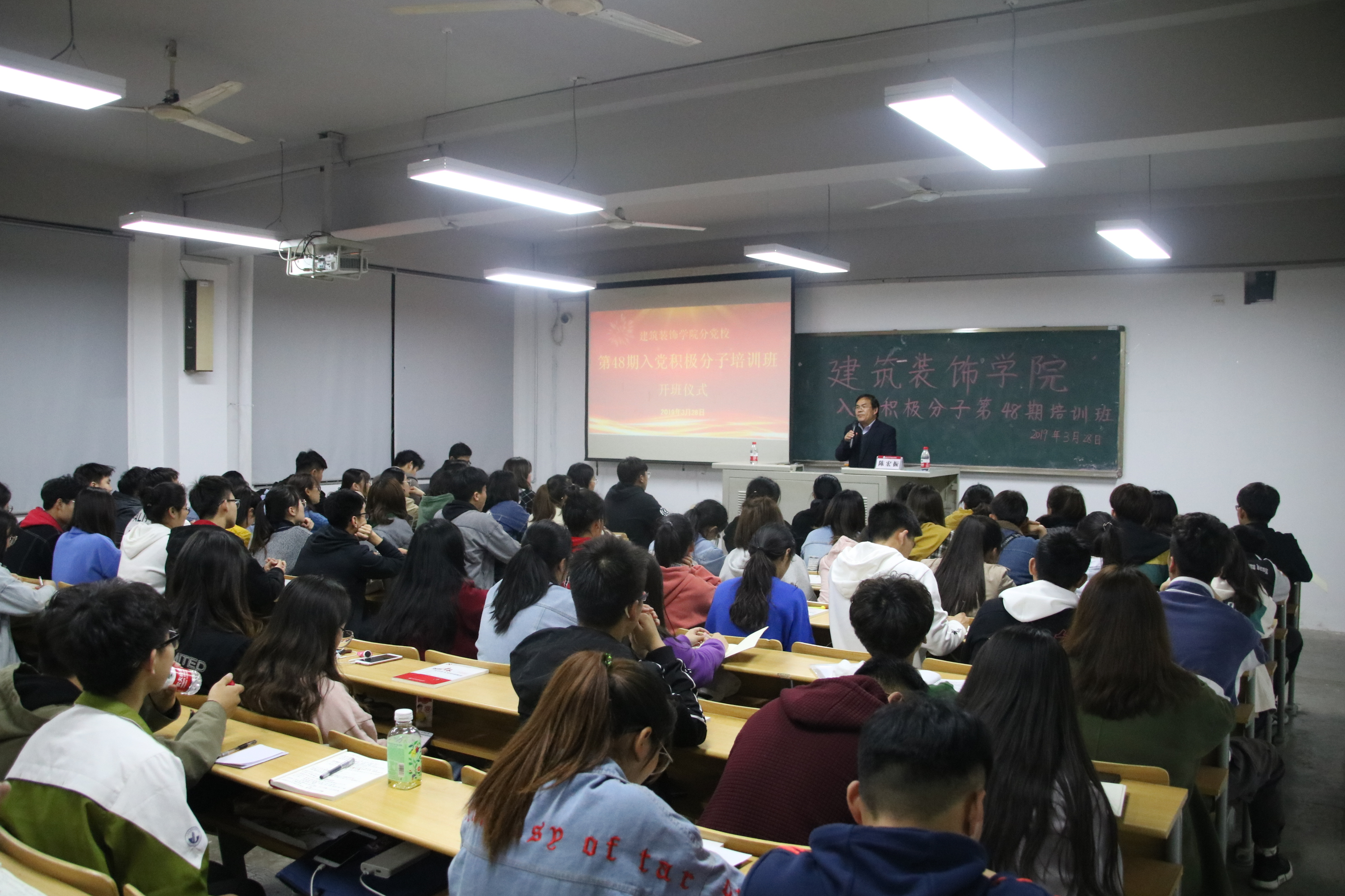 328日,BB贝博艾弗森第48期入党积极分子培训班在教二楼106教室开班。公司党总支书记陈宏振、副书记李彦江、专职辅导员张龙出席开班仪式,装饰公司100名入党积极分子参加培训,开班仪式由张龙主持。