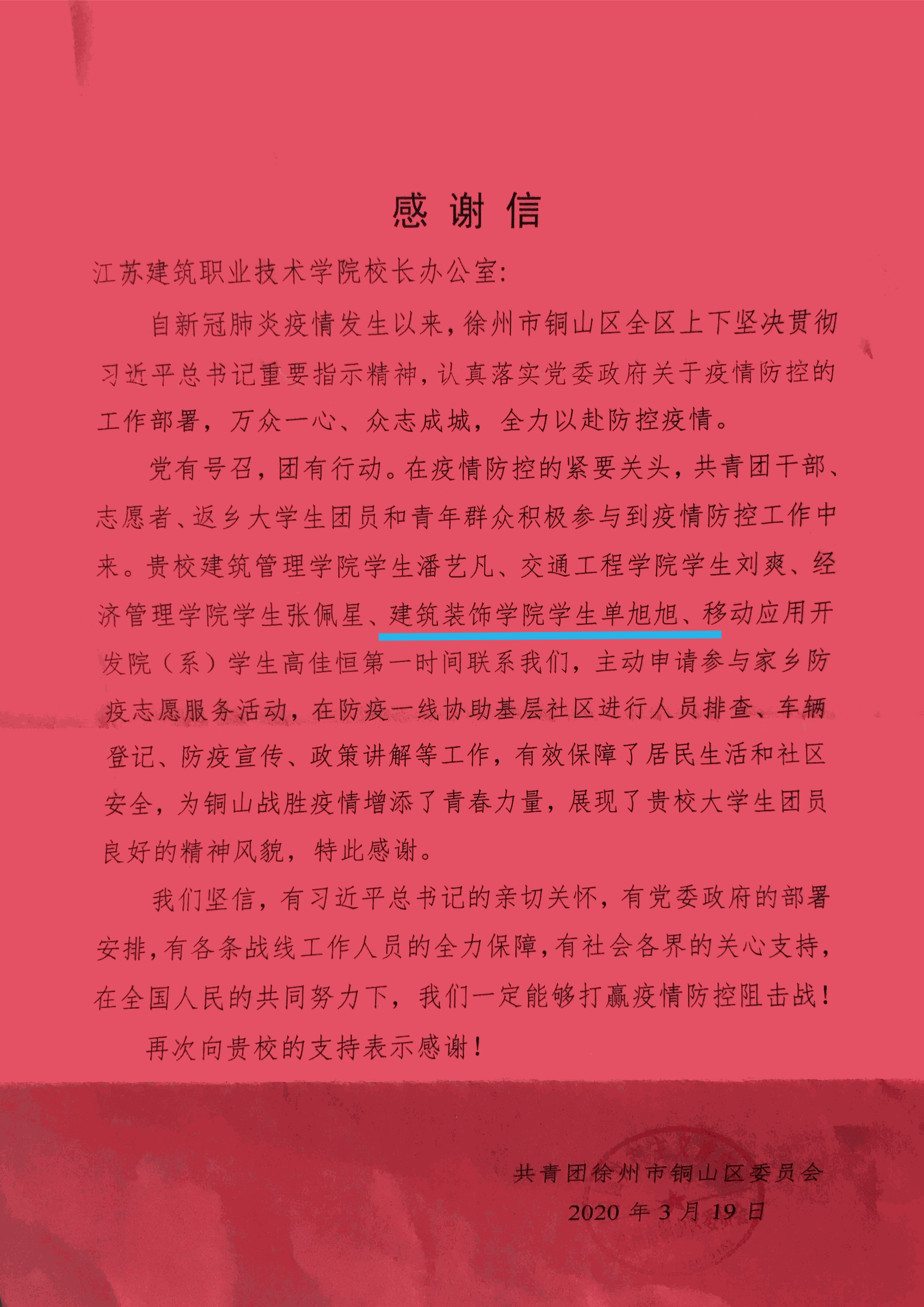 近日,公司收到来自共青团铜山区委的一封感谢信。来信指出,公司5名老员工志愿者响应党的号召,主动联系并积极参与家乡的新冠肺炎防控志愿服务工作,为铜山战胜疫情增添了青春力量,展现了公司老员工团员良好的精神风貌,对公司表示感谢。其中,公司园林19-1班单旭旭同学在本次战“役”中,积极参与社区排查、车辆登记、防疫宣传、政策讲解等工作,表现突出,受到了表扬和感谢。
