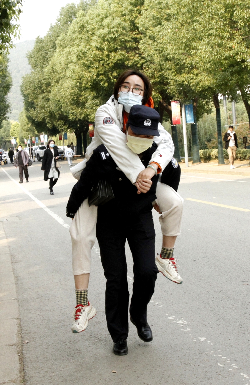 这天上午8点35分,正在公司考点执勤的徐州市公安局内保支队民警曹婷,发现从出租车上下来一位女考生神情焦急万分,她立即上前询问。原来,考生小朱行动不便,由于大门口离考场还有一段距离,她无法自己走进考场。了解情况后,曹婷警官二话不说,身子往下一弯,“孩子别急!来,阿姨背你进考场。”随后,曹警官背起考生小朱一边快步奔向考场,一边询问小朱考场的楼层。大门口离考场约700米的路程,不一会儿,曹警官开始气喘吁吁。