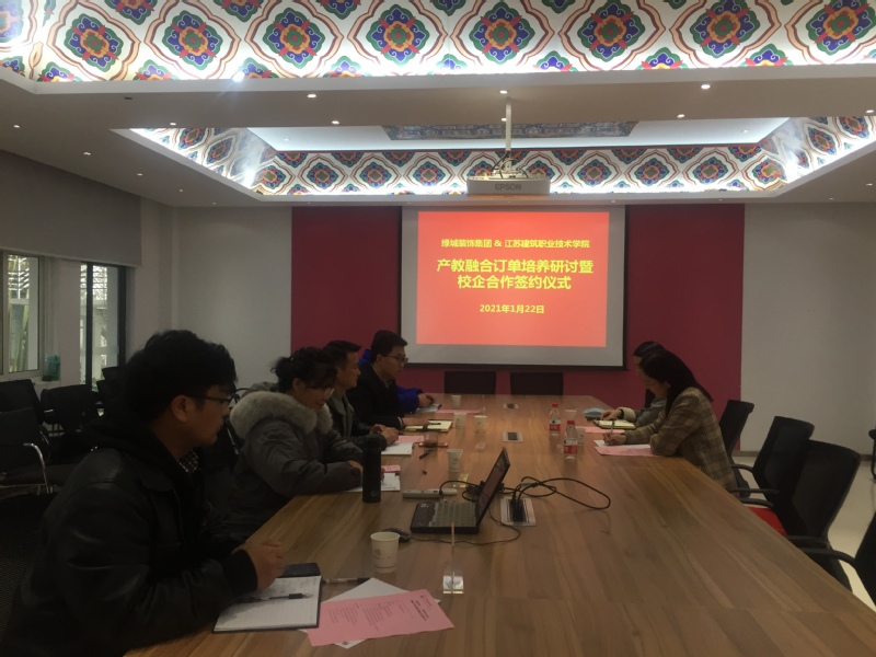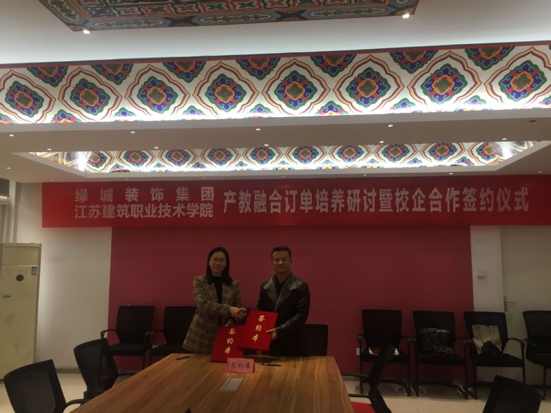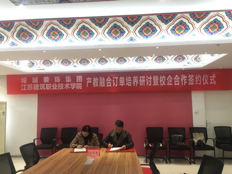 校企合作处处长娄志刚处长介绍公司发展和公司校企合作情况,装饰公司陈志东经理介绍了装饰公司办学特色和发展成就,绿城装饰集团人力资源部孟黎佳总监介绍了绿城装饰集团的发展情况。装饰公司陈志东经理和绿城装饰集团人力资源部总监孟黎佳签订校企合作协议,同时在绿城装饰集团建立“博士工作站”,在公司建立“企业工作站”。