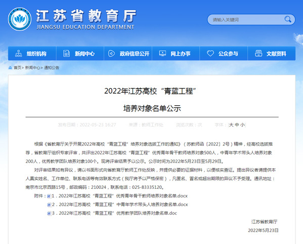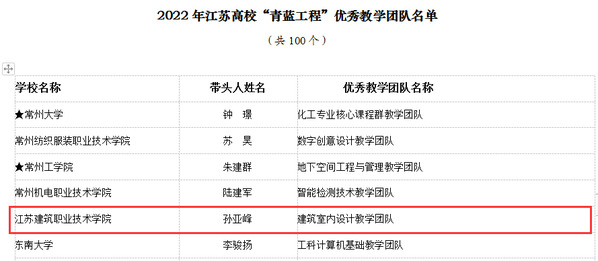 近日,江苏省教育厅公示2022年江苏高校“青蓝工程”培养对象名单,共评出2022年江苏高校“青蓝工程”优秀青年骨干教师培养对象500人,中青年学术带头人培养对象200人,优秀教学团队培养对象100个。公司孙亚峰教授为带头人的建筑室内设计教学团队获评2022年江苏高校“青蓝工程”优秀教学团队。