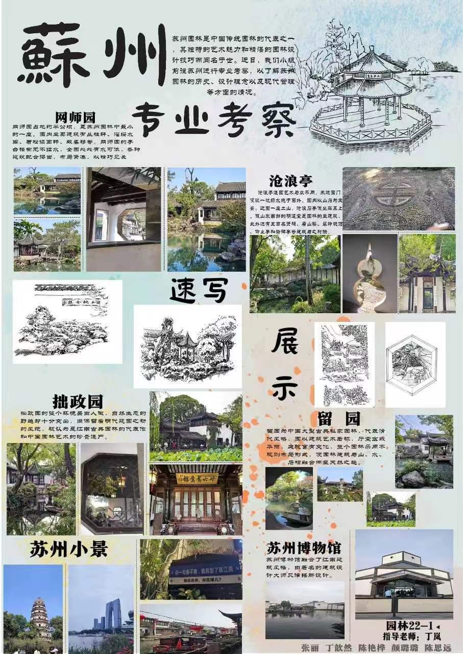 根据公司园林工程技术专业教学进度安排,2023年10月23日至10月28日,专业考察由丁岚、吴小青教师带队指导,园林工程技术专业2022级两个班五十余名同学赴苏州顺利完成了专业考察教学活动,并在BB贝博艾弗森举办了专业考察课程成果汇报展。