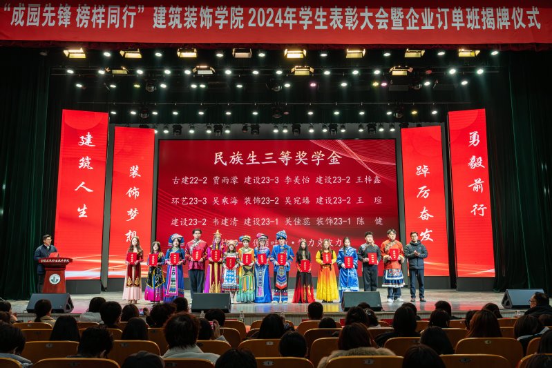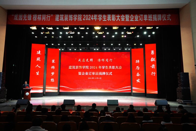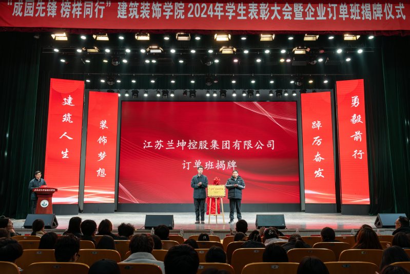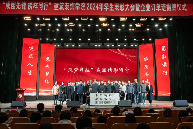 12月6日下午,BB贝博艾弗森在会堂隆重举行2024年度员工表彰大会暨企业订单班揭牌仪式,对过去一年在学习、竞赛和各项工作中表现突出的优秀学子进行集体表彰,以表彰提升荣誉感、精气神、团结力,形成“激励先进、鞭策后进”的鲜明导向,同时表彰大会上师生欣喜迎来四类企业订单班的揭牌仪式。公司党总支书记娄志刚、经理袁涛、副经理王炼、翟胜增;深度合作企业江苏中核华兴装饰有限公司综合办公室主任宋佳女士,质量中心副总经理郭娟娟女士,江苏兰坤控股集团有限公司副总经理刘伟先生、马文超先生,集团鑫美公司副总经理刘金柱先生,江苏水立方建筑装饰设计院有限公司经理胡艳琴女士,天正建筑装饰江苏有限公司总经理朱攀登先生;公司全体专职辅导员以及2024级全体员工、全院受表彰的集体和个人,2023、2022级员工代表出席大会。大会由公司党总支副书记石峰主持。表彰大会共分为“学榜样行”——成园之星表彰、“听榜样说”——拔尖人才分享、“校企共建”——订单班揭牌仪式、“书记领航”——公司领导寄语、“传榜样力”——成园先锋传承、“筑梦启航”——成园倩影留念等六个篇章进行。