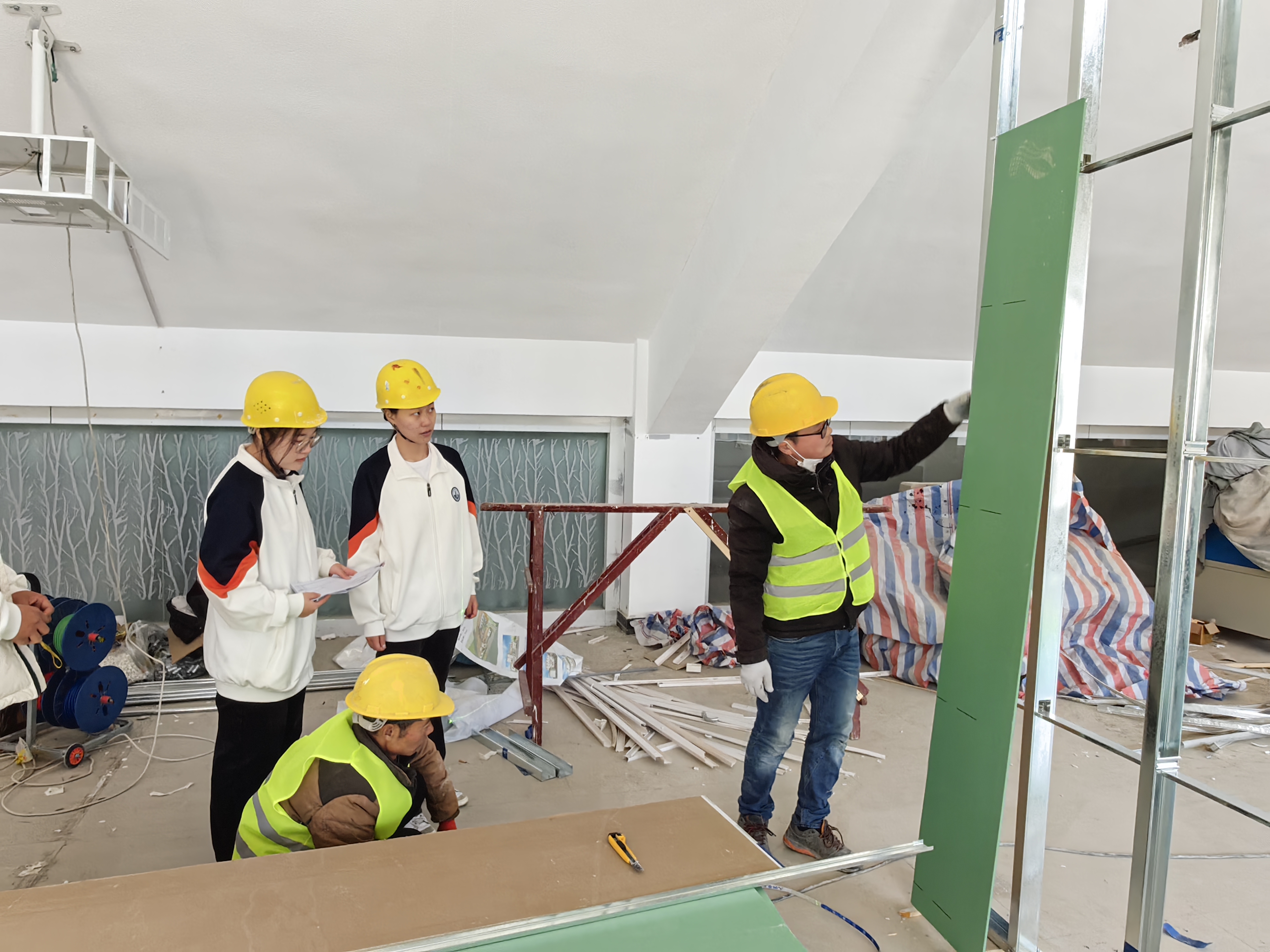 作为BB贝博艾弗森重点打造的生产性实践载体,数字装饰工程训练中心建设全过程贯彻做中学、学中做育人理念,构建起大三做设计、大二进现场、大一学识图、教师强指导的共学共建模式。项目启动以来,大三员工团队在教师指导下完成施工图深化设计;大二员工进驻工地开展测量放线、材料加工等实操;大一新生通过现场观摩学习图纸识读,形成完整的实践能力培养链条。目前开展的墙面工程阶段,通过专业课教师驻场指导,企业工程师同步进行技术交底的方式,师生共同参与材料选型、工艺制定等全流程环节,真正实现教室与工场合一、教师与师傅合一、员工与学徒合一”。师生已协同完成轻钢龙骨隔墙安装、石膏板封板等关键工序。
