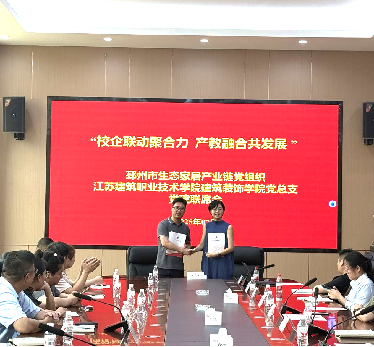 活动中,邳州市官湖镇党委副书记王玥表示,此次活动是推动党建共建、校企对接、协同育人工作实现深度融合的重要举措,将以此对接为契机,积极为邳州生态家具产业链搭建平台,提供优质服务,期待双方能在人才培养、技术创新、成果转化等方面取得丰硕成果。公司党总支书记娄志刚强调,此次党建结对共建活动不仅是一次党建交流,更是推动产教融合、校企合作向纵深发展的关键一步。学院将充分发挥专业特色、人才优势,针对产业链企业的实际需求,探索教育、科技、人才的融合发展模式,为地方经济发展贡献力量。随后,双方代表签署了党建结对共建协议,正式确立了共建合作关系。同时,产业链多家企业与公司围绕共同目标开展了积极主动且富有成效的交流座谈。不仅加深了彼此之间的了解,还共同探讨了行业发展趋势、分享了各自的成功经验和创新成果。
