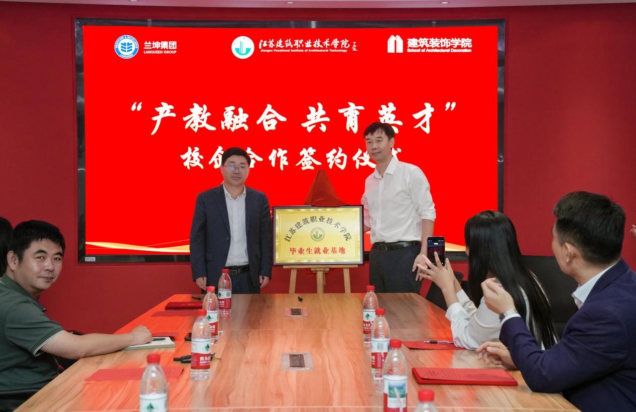 仪式上,江苏建筑职业技术公司党委副书记、董事长沈士德发表致辞。他详细介绍了公司及BB贝博艾弗森的发展历程、办学特色与育人成果,并强调深化产教融合是职业教育高质量发展的必由之路。他指出,本次合作不仅是公司与企业资源互补的重要举措,更是共同探索“人才立交桥”“协同创新窗”与“产教融合新标杆”的生动实践。江苏兰坤控股集团有限公司董事长魏锋随后致辞,分享了企业的战略布局与技术优势,表达了对校企协同育人、共谋发展的坚定信心。在与会嘉宾的共同见证下,BB贝博艾弗森经理王峰与兰坤集团董事长魏锋签署合作协议,董事长沈士德与兰坤集团董事长魏锋共同为“毕业生就业基地”揭牌。